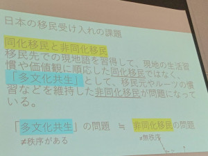 講演の終盤に「多文化共生基本法」構想があることを知りました。国会で議員立法により法案が提出されているそうです。国会議員の中にも問題意識を持っている方たちがいることに安堵いたしました。それにしても政府の無責任には呆れます。〇〇ホームタウン構想など、外国人の移民政策ともとれる動きを活発化させていますが、その前に入国する外国人に対し、多文化共生するための最低の知識、ルールを教授する仕組みを法制化すべきではないでしょうか。